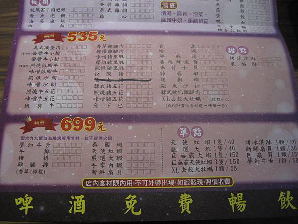 店內採吃到飽消費方式,價位分為439元/535元及/699元三種價位,食材內容依不同價位漸進豐富,其中439及535元價位有包含火鍋,而699元所進階供應的食材多為燒烤專用食材所以就不含括火鍋的部份囉,今天體驗的是699元方案,整張食材單除火鍋料及單點部份都可任點(XL去殼大牡犡限點一次),各式肉品.海鮮.鮮蔬.小菜.甜點,算一算699元可點用的食材有近百樣呢.
