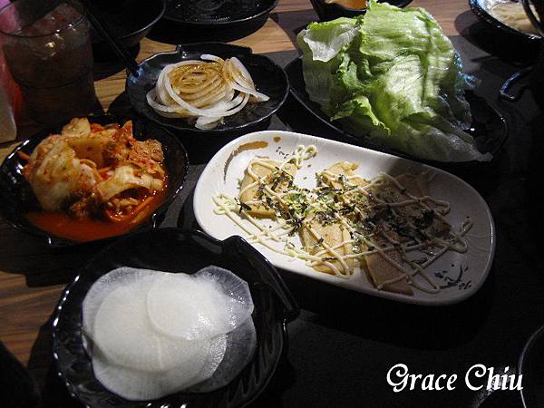 除了以調味備品來為食材提味外,點些沙拉小菜來搭配吃也是不錯的方式,不論是和風洋蔥絲.韓式泡菜.特製醃蘿蔔都跟肉品很合搭.