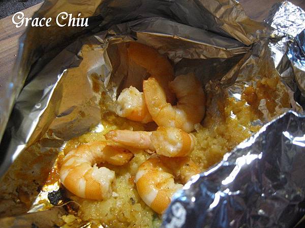 蒜蓉蝦,包在錫箔紙裡燜烤,除了蒜蓉外還加了奶油,一打開香氣大噴發.