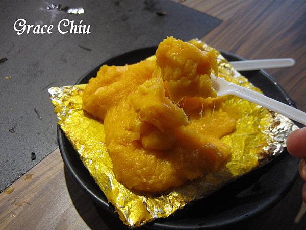 起司地瓜,香滑的地瓜泥加上起司絲一起加熱攪拌,挖起來有微微牽絲,有點軟有點Q的口感很特別.
