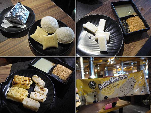 烤冰淇淋,由吐司包冰淇淋壓製而成,外皮在炭火上烤的微酥脆就可以食用,外層酥香內餡冰涼,今天吃到花生味的內餡/烤麻糬,麻糬烤到膨起來後先沾點煉乳再裹上花生粉,滋味香甜軟Q/乳酪酥裡包著優格味餡料,熱騰騰烤好咬開會爆漿請小心食用/第一次吃到阿奇儂這款珍珠奶茶雪糕,裡面加了迷你小珍珠口感不錯,奶茶味香甜不膩.